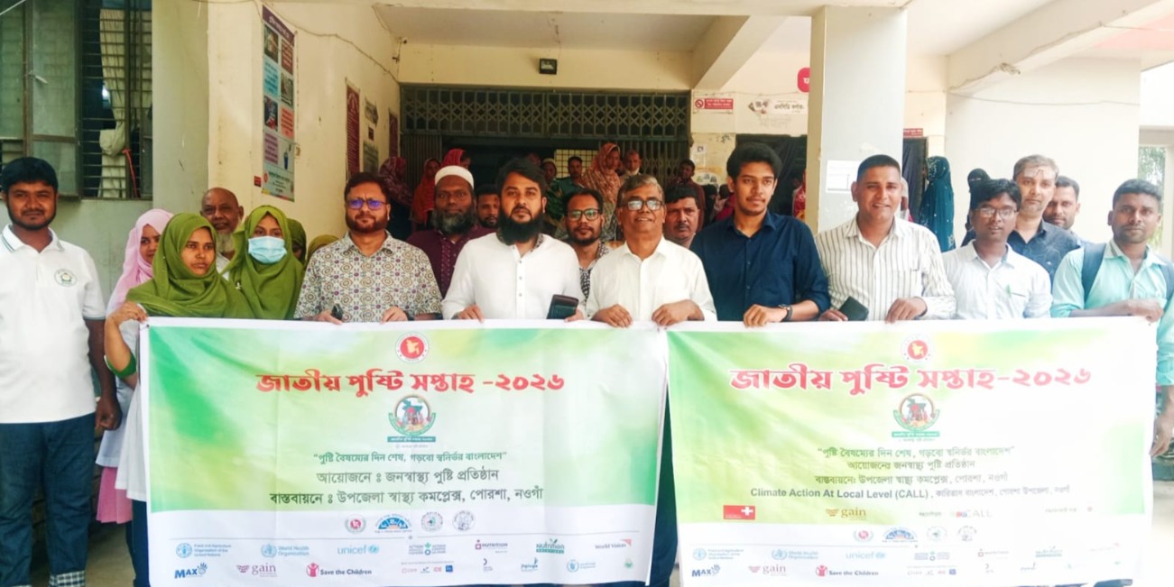 নওগাঁর সাপাহার ও পোরশা উপজেলায় জাতীয় পুষ্টি সপ্তাহ-২০২৬ যথাযথভাবে উদ্বোধন ও উদযাপন করা হয়েছে। “পুষ্টি বৈষম্যের দিন শেষ, গড়বো স্বনির্ভর বাংলাদেশ” এই প্রতিপাদ্যকে সামনে রেখে আয়োজিত এসব কর্মসূচিতে পুষ্টি বিষয়ে জনসচেতনতা বাড়ানোর ওপর বিশেষ গুরুত্ব দেওয়া হয়।