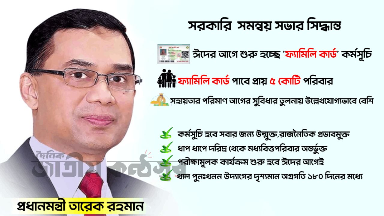 গতকাল সকালে সচিবালয়ে প্রধানমন্ত্রী তারেক রহমান-এর নেতৃত্বে অনুষ্ঠিত আন্তঃমন্ত্রণালয় সভায় এ সিদ্ধান্ত চূড়ান্ত হয়। বৈঠকে ফ্যামিলি কার্ড চালুর অগ্রগতি ও বাস্তবায়ন পদ্ধতি নিয়ে মন্ত্রীদের অবহিত করা হয়। কর্মসূচি বাস্তবায়নের লক্ষ্যে অর্থমন্ত্রী আমীর খসরু মাহমুদ চৌধুরী-এর নেতৃত্বে একটি উপকমিটি গঠন করা হয়েছে, যা আগামী তিন দিনের মধ্যে প্রতিবেদন জমা দেবে।